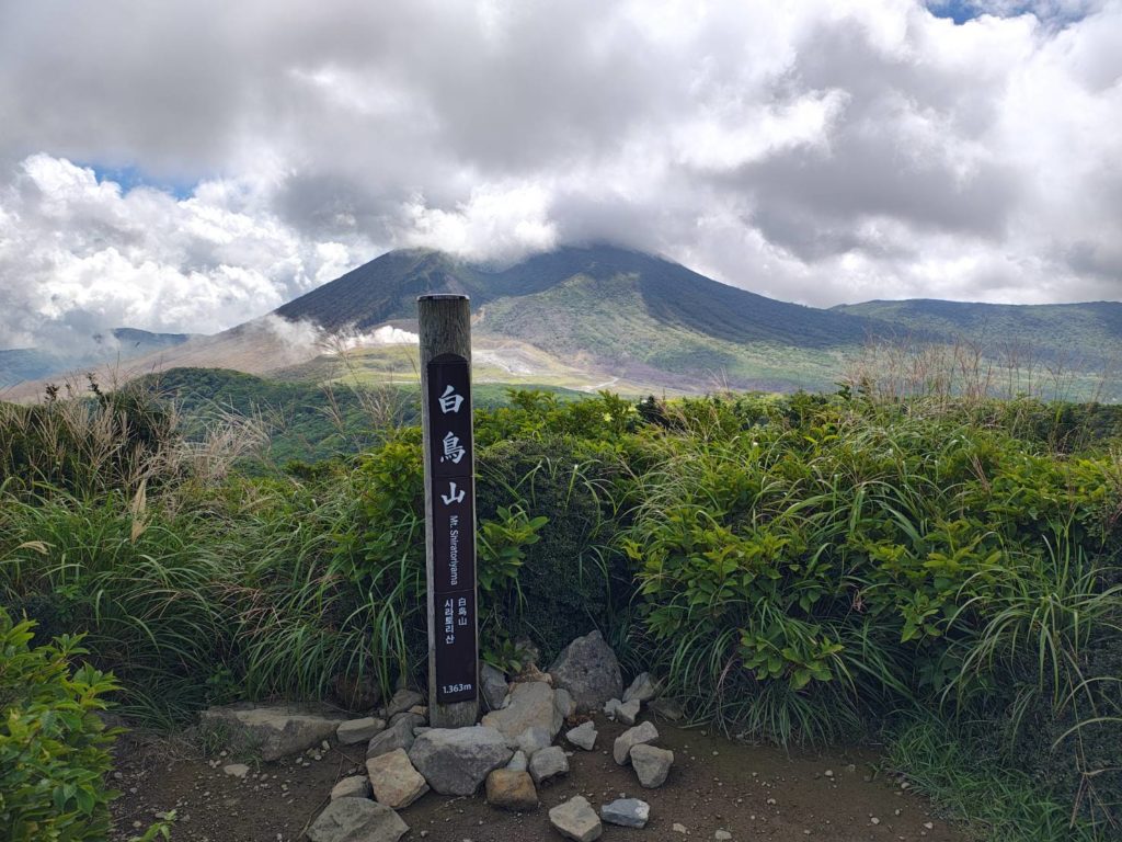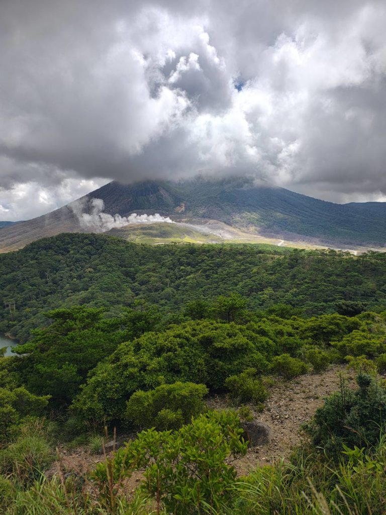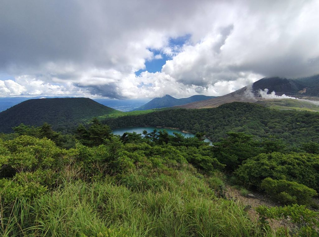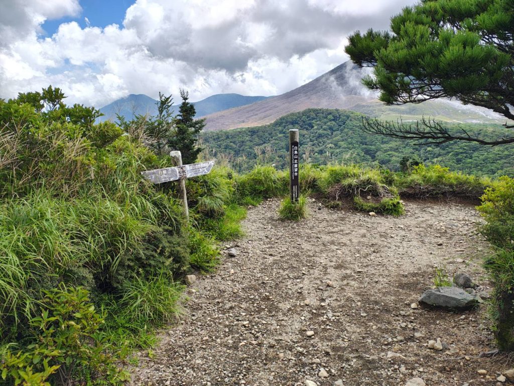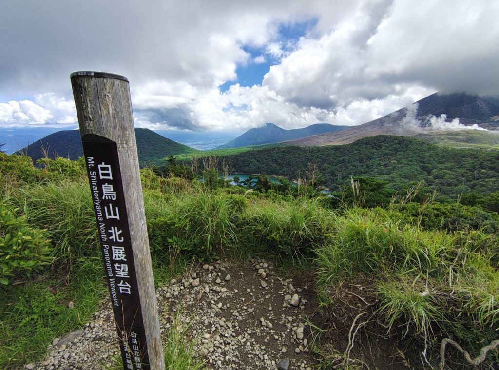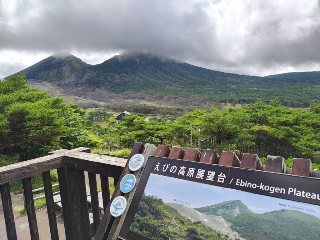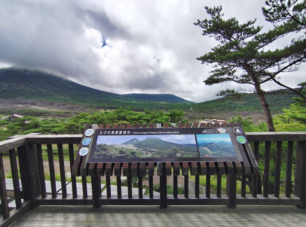 昨日のせいで太ももの前が痛い5分ほどでえびの高原展望台へ着いた、昨日登った韓国岳が見える。